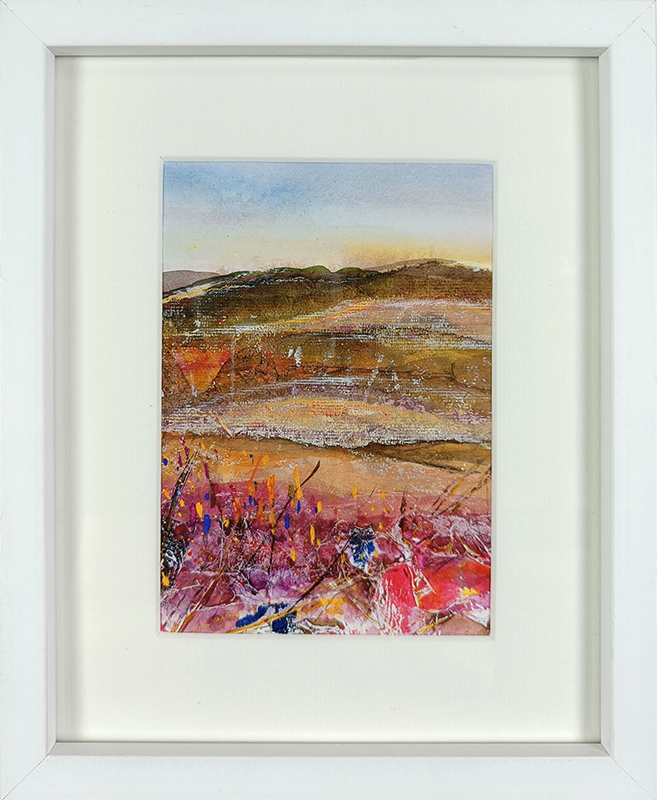 These two little landscapes, that work as a pair or on their own, were created from one larger piece in which I experimented with collage effects using textiles and maps.
