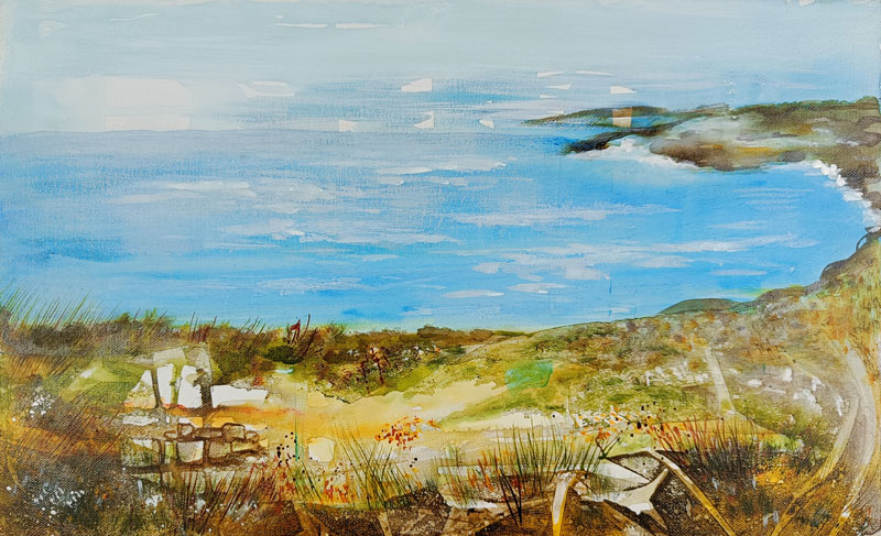 I love the coastline of North Cornwall with its rustic ambience and landscapes that change through the seasons. This is just one study in which I have tried to capture the textures of grass and stone. I used acrylic ink, surface texture and water colour markers.
